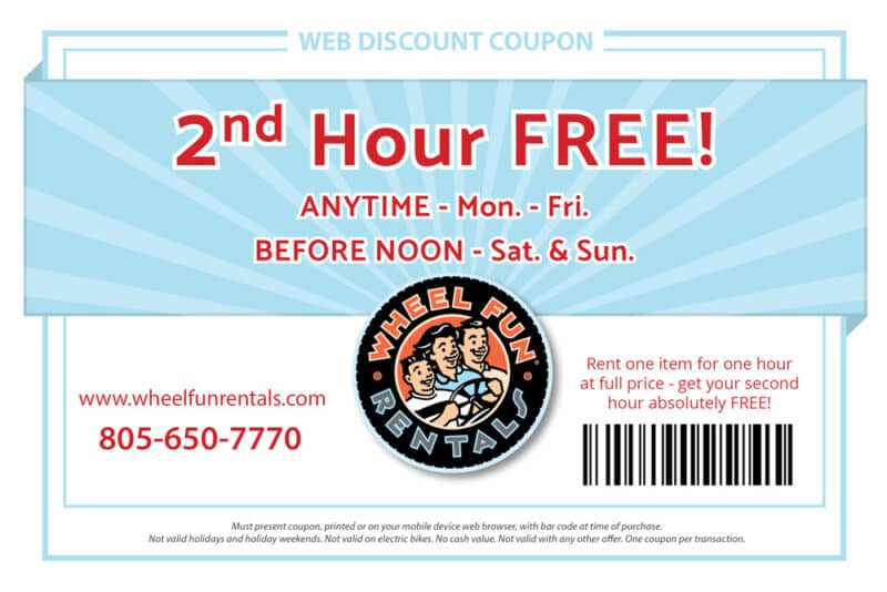 Enjoy this bicycle rental coupon valid at Shoreline Village. Just print this page and present to your rental clerk at time of purchase. Only one coupon valid per transaction.