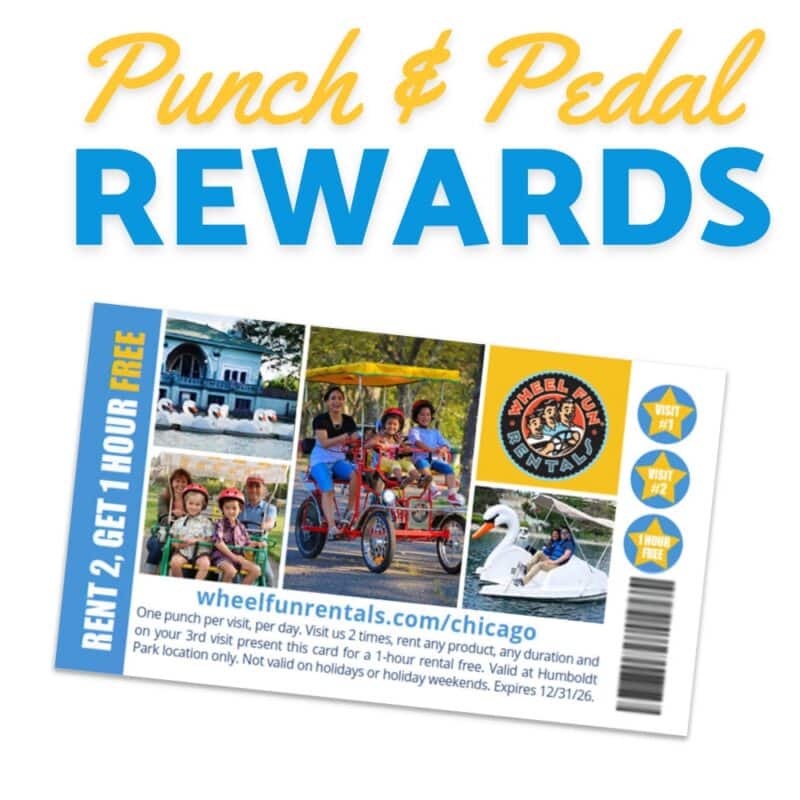 At Wheel Fun Rentals Humbodlt Park, every ride brings you closer to your next FUN adventure! With your very first rental you’ll receive a “Punch & Pedal” Rewards Card and already have a head start – your first visit hole punch!