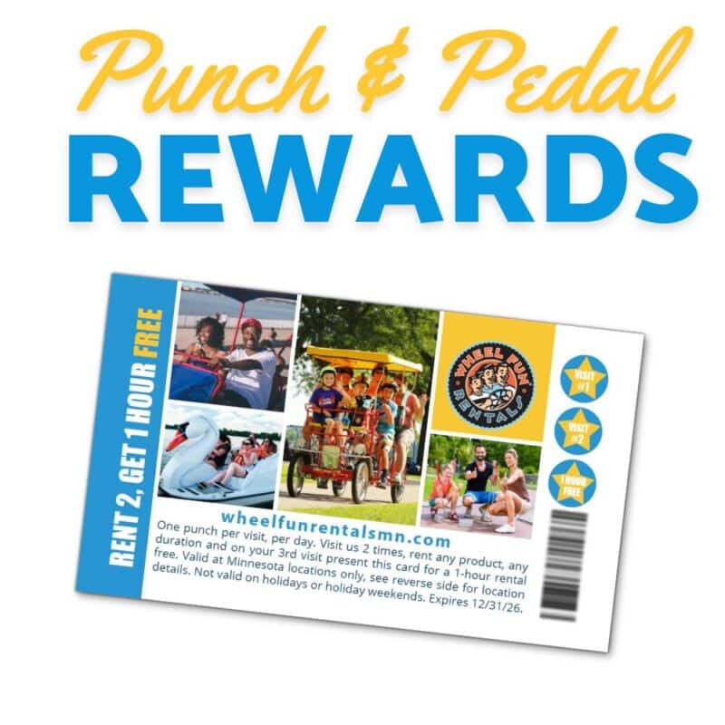 At Wheel Fun Rentals Minnesota, every ride brings you closer to your next FUN adventure! With your very first rental you’ll receive a “Punch & Pedal” Rewards Card and already have a head start – your first visit hole punch!